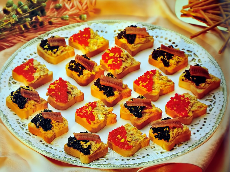 Spread the toast with this pâté and cover with a layer of caviar substitute and put some grated egg white on top.